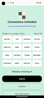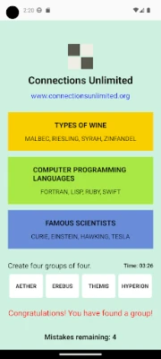 But, there's a catch! You've only got four mistakes to spare before you'll have to start anew. Whether the puzzles are straightforward or designed to truly challenge your brain, Connections Unlimited guarantees hours of fun and excitement. Don't wait any longer. Dive in and find those hidden connections!