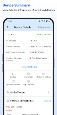 Efficiently execute tasks such as reviewing configuration changes, conducting backups, resolving startup-running conflicts, updating IP addresses and hostnames, and halting device operations.