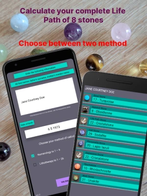 Possibility to choose between numerological calculation from 1 to 9 and lithotherapy calculation from 1 to 26.